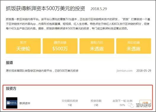 2018年5月底,区块链内容平台“抓饭”宣布获得王鑫新湃资本500万美元融资。