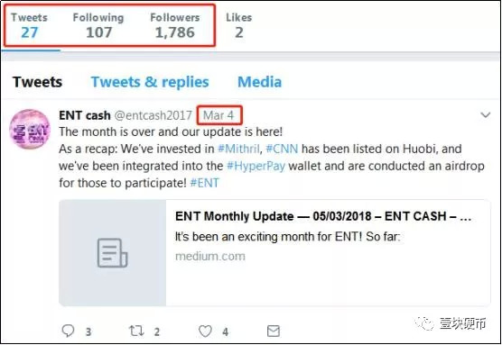硬币君浏览其官方推特发现,信息只更新到3月4日,发布内容为2月的月报。同时提到ENT投资的两个项目Mithril和CNN已上线交易平台火币。