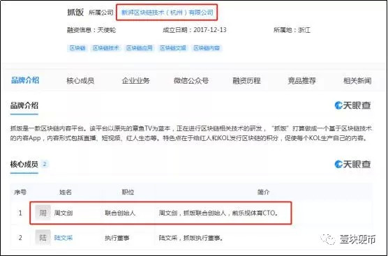 硬币君查询天眼查数据发现,“抓饭”归属为新湃区块链技术(杭州)有限公司,该公司于2018年5月29日获得新湃资本500万美元融资;核心成员栏显示,前乐视体育CTO周文剑为抓饭联合创始人。