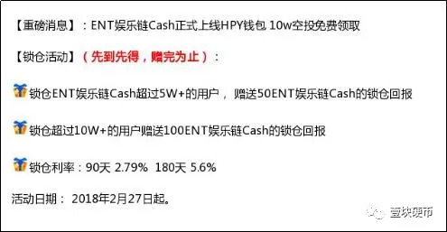 上线了交易平台的ENT,又在2018年2月26日推出锁仓活动,但不是项目方锁仓。用户在一款HPY钱包中锁仓ENT达一定数量和时间,就能再得到ENT作为回报。