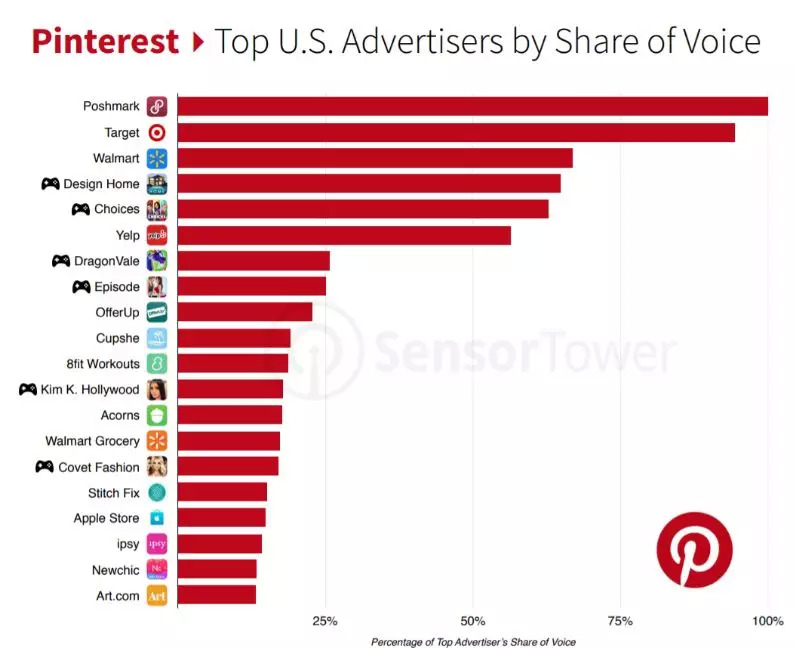 美国Pinterest平台TOP20广告主占有率排名