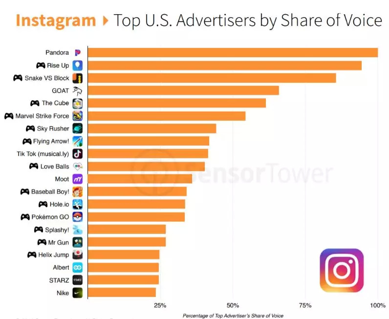 美国Instagram平台TOP20广告主占有率排名