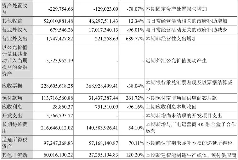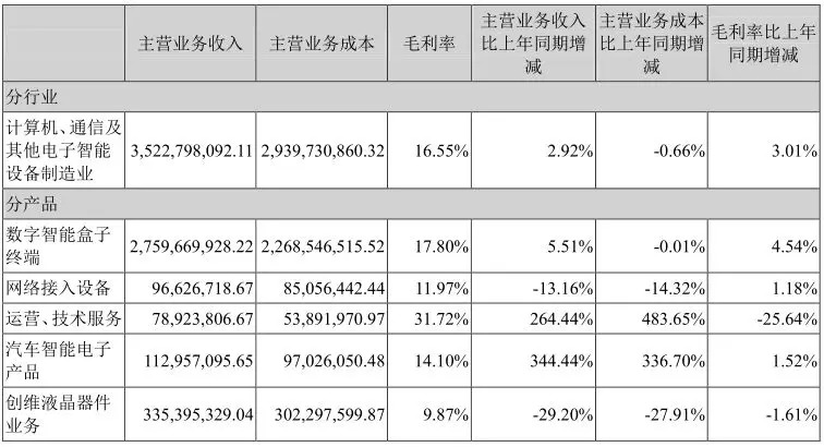 报告期,数字智能盒子及网络接入终端等实现营收30.27亿,同比增长4.25%。报告期公司海外市场在亚太、南非、印度、南美、欧洲等区域实现批量销售的同时,基于新型态IP化市场需求的逐步显现,公司也重点投入安卓生态系统系列新产品的研发,建立和Google,Netflix等的战略合作基础,实现海外市场DVB+OTT、OTT等区域市场的新突破。