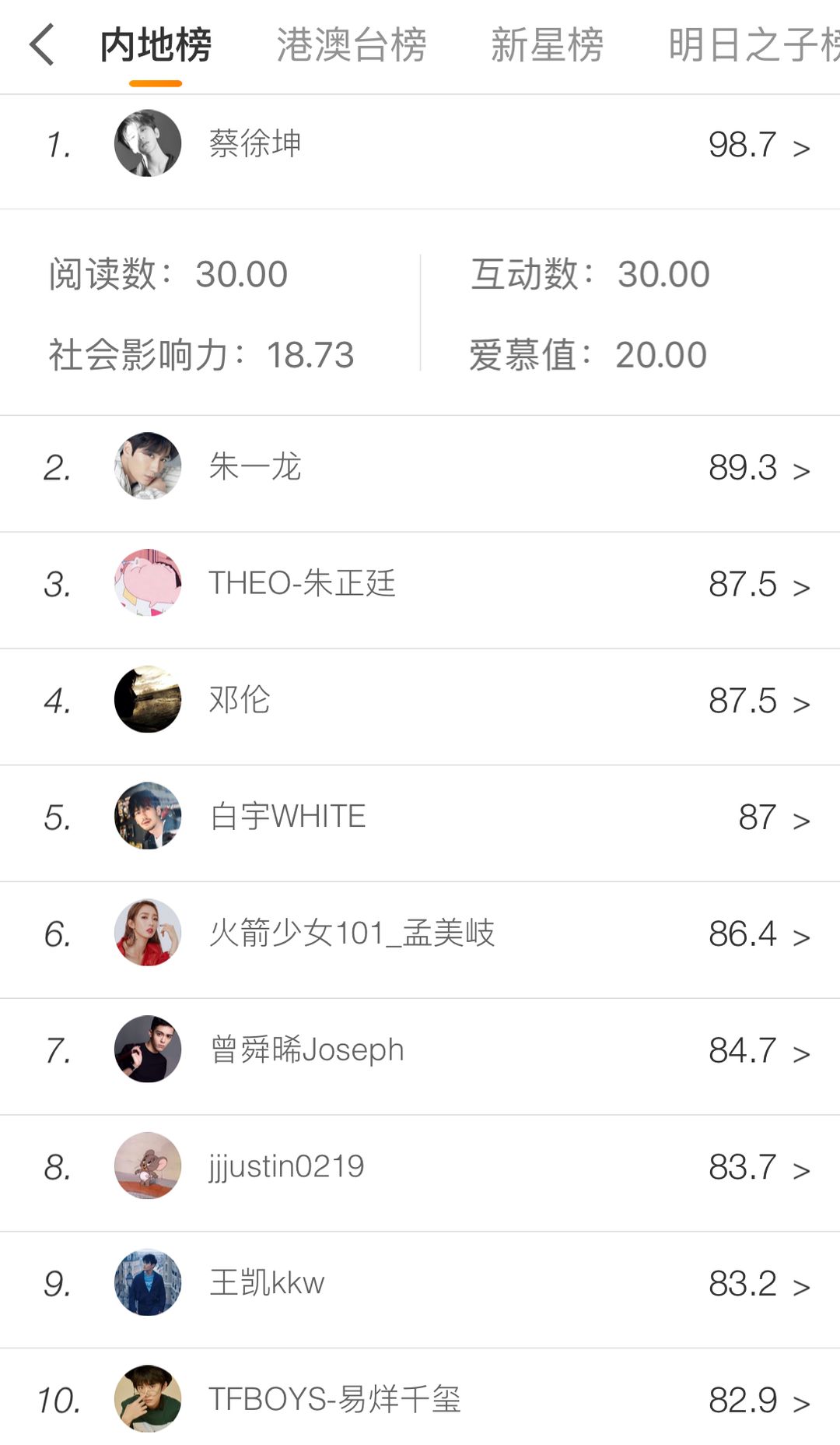 易烊千玺8月15日,也就是宣布品牌代言的当天四项得分分别是:阅读数27.22,互动数28.46,社会影响力19.13,爱慕值8.14,最终得分82.95, 位列“明星势力榜”第十位。第一名是蔡徐坤,二三名是朱一龙和朱正廷,前三名你有点陌生?那就对了,他们都来自选秀节目《偶像练习生》,这是96年实习生告诉我的,说两位大家熟悉的:鹿晗第11,吴亦凡第13。