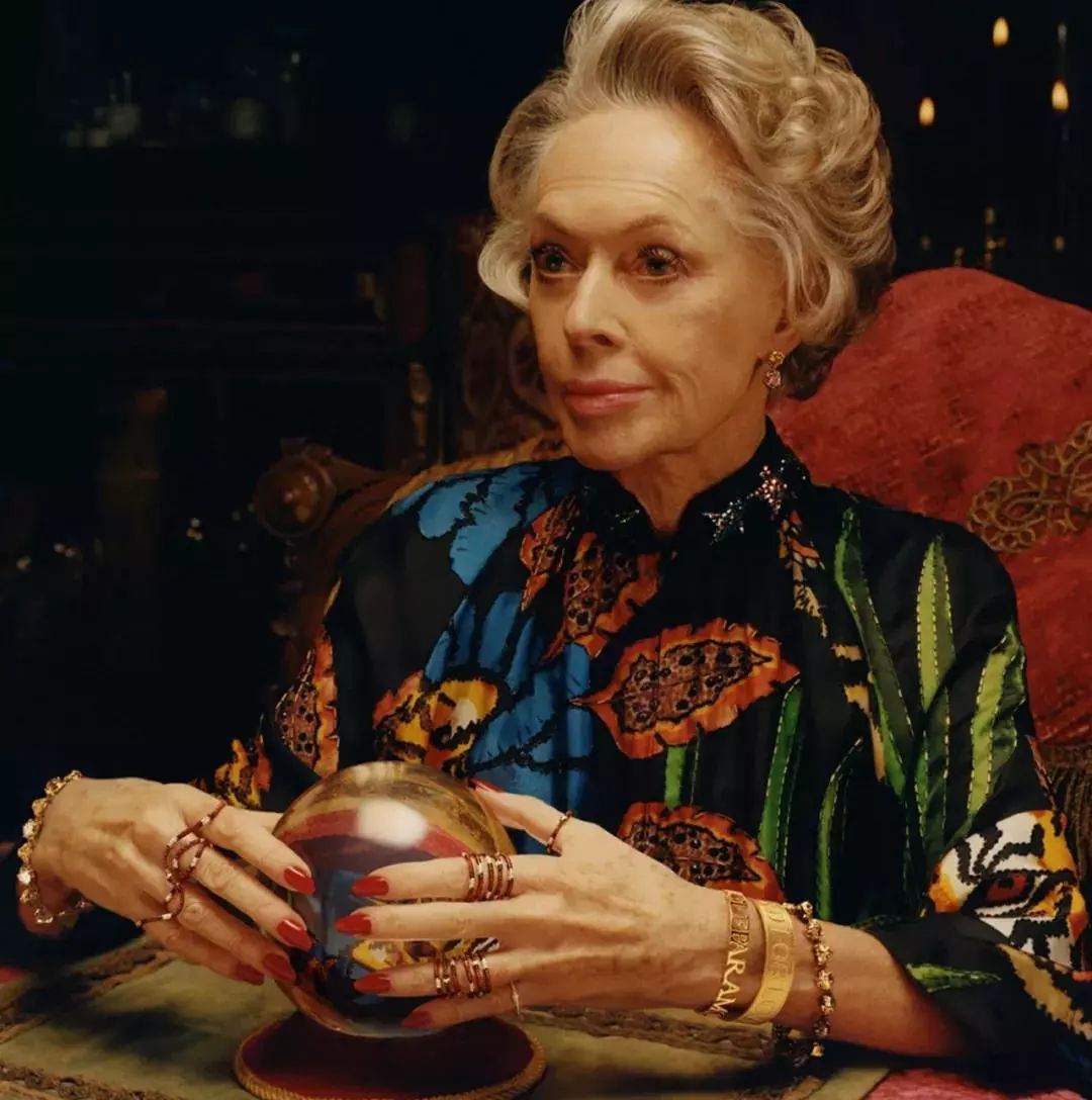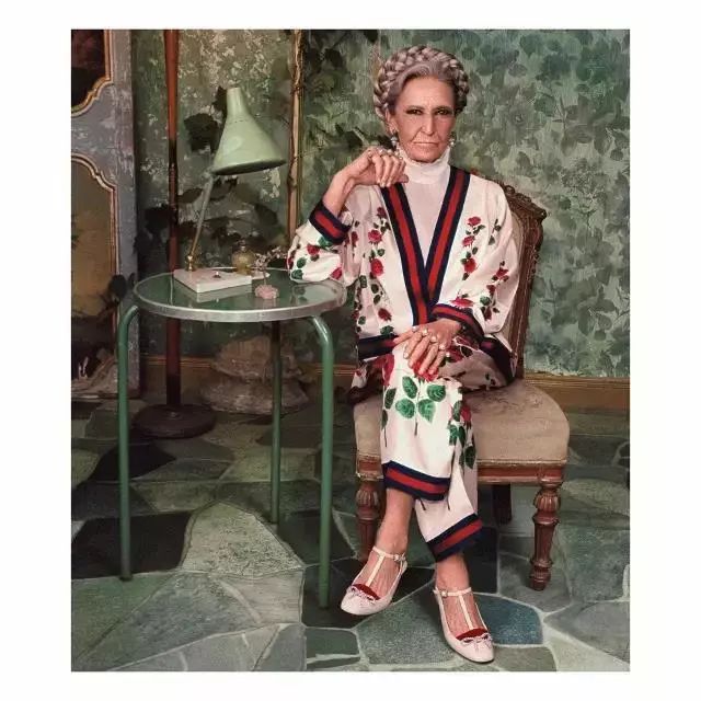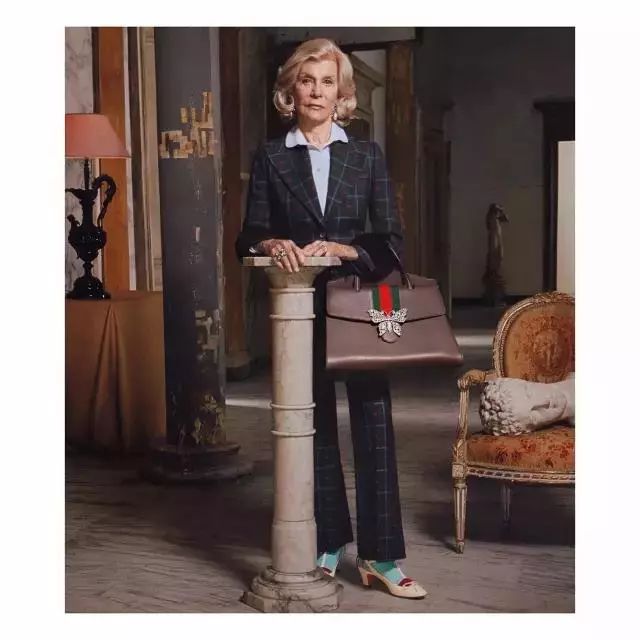 嗯,我们是否闻到些不一样的味道,如果还没有,我再举几个和Gucci有关的例子。早在2016年9月,Gucci公布的2017早春大片里,就出现了“老奶奶”,在此广告形象大片中,朋克青年们与著名的英国资深戏剧女王瓦妮莎 雷德格雷夫(Vanessa Redgrave)共同出镜,刻画出兼收并蓄的英伦美学精神。接着在2018早春大片里,同样是“白发云集”,在今年5月份的腕表广告片里占卜师的角色,由美国传奇女演员蒂比 海德莉 ( Tippi Hedren ) 领衔主演,她是模特出身,在60年代以大导演希区柯克的经典电影《群鸟》一片成名,拿下金球奖最佳新人奖。