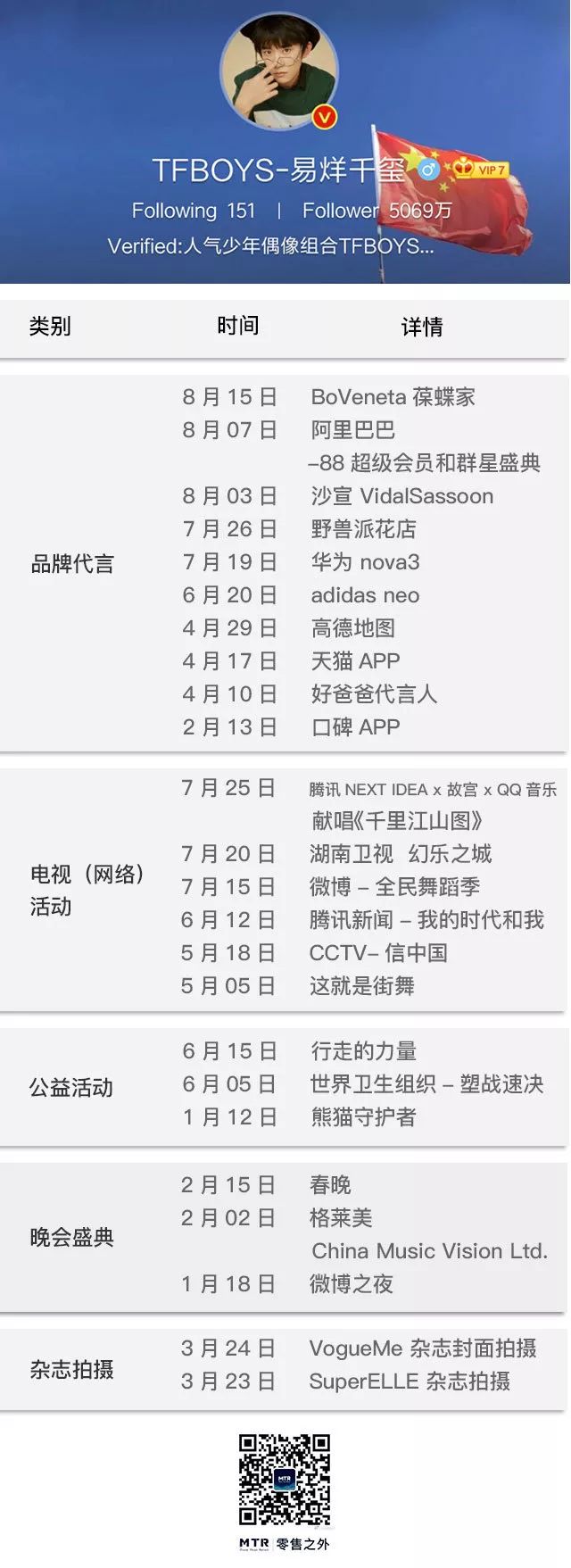 为了进一步证实,我还是打开微博做了进一步验证,尽量用数字和事实冲淡一些个人的主观臆断。首先回顾了一下易烊千玺工作室在微博上开设的帐号,这里可不是这位小鲜肉和粉丝互动的场所,没什么个人分享,基本就是明星经纪公司的工作业绩公示栏,从商业活动到品牌代言,从杂志大片到公益行动,我们将2018年初到现在为止的帐号内容作了一个整理,大家自己感受一下。