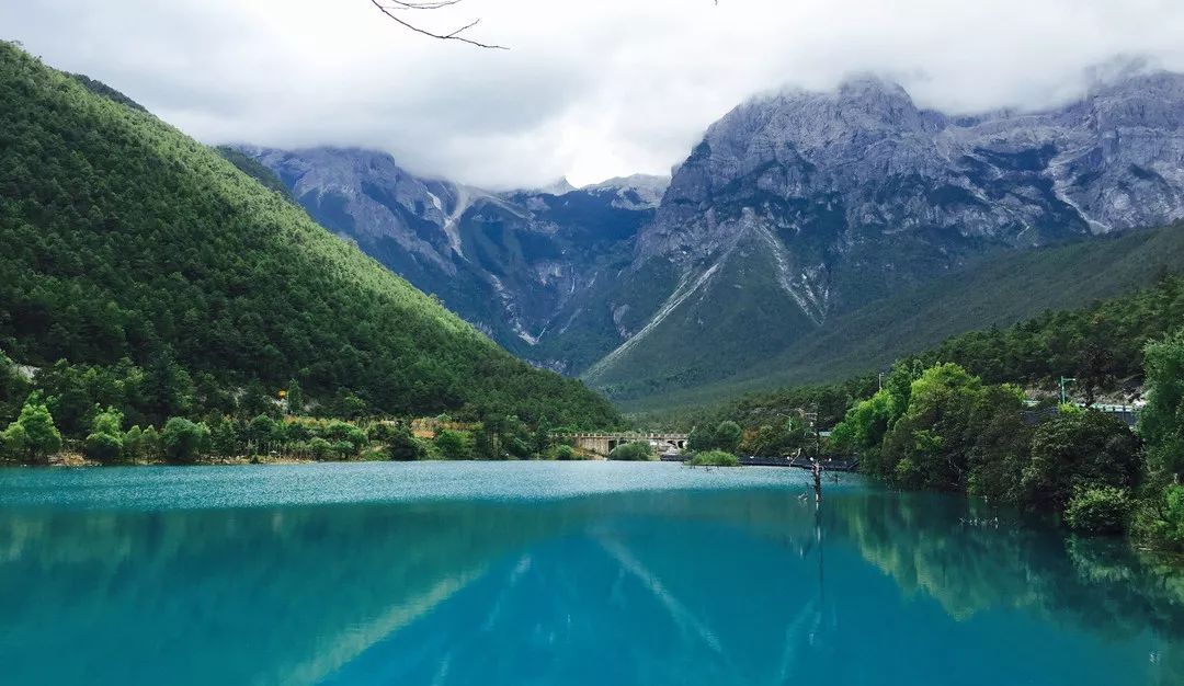 如果在镇上逛够了,那就去玉龙雪山下的白水河转转。那里是当地人最喜欢去的地方之一,小情侣常会相约去河边戏水,或一起沿河骑车漫步。天气特别晴好的时候,在阳光的照射下,河水会变成蓝色,而山谷又是弯弯的月牙形状,远远看去,就像是一弯蓝月镶嵌在玉龙雪山脚下,因此,白水河还有一个更好听的名字,蓝月谷。
