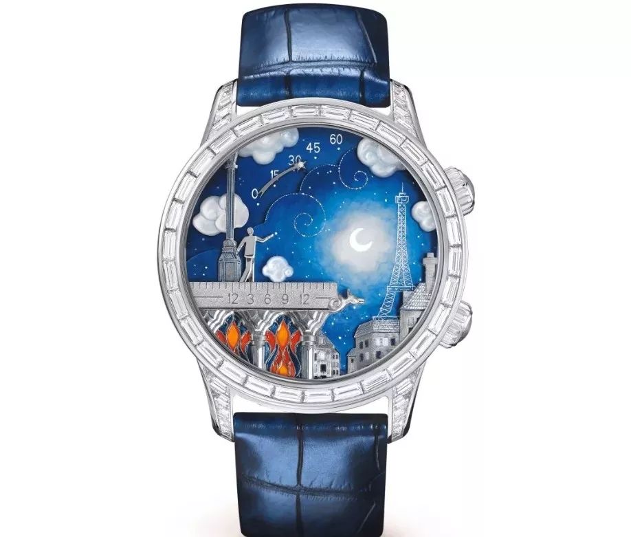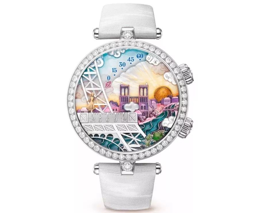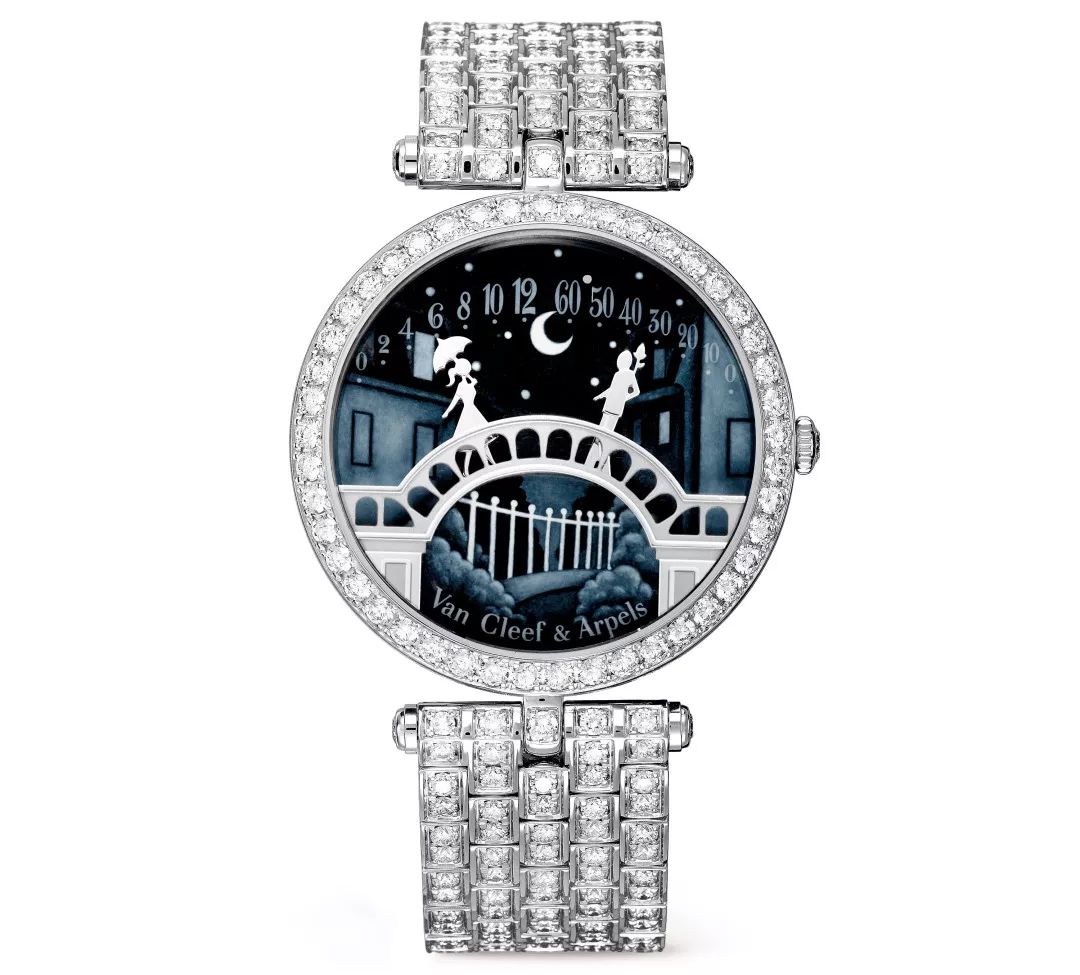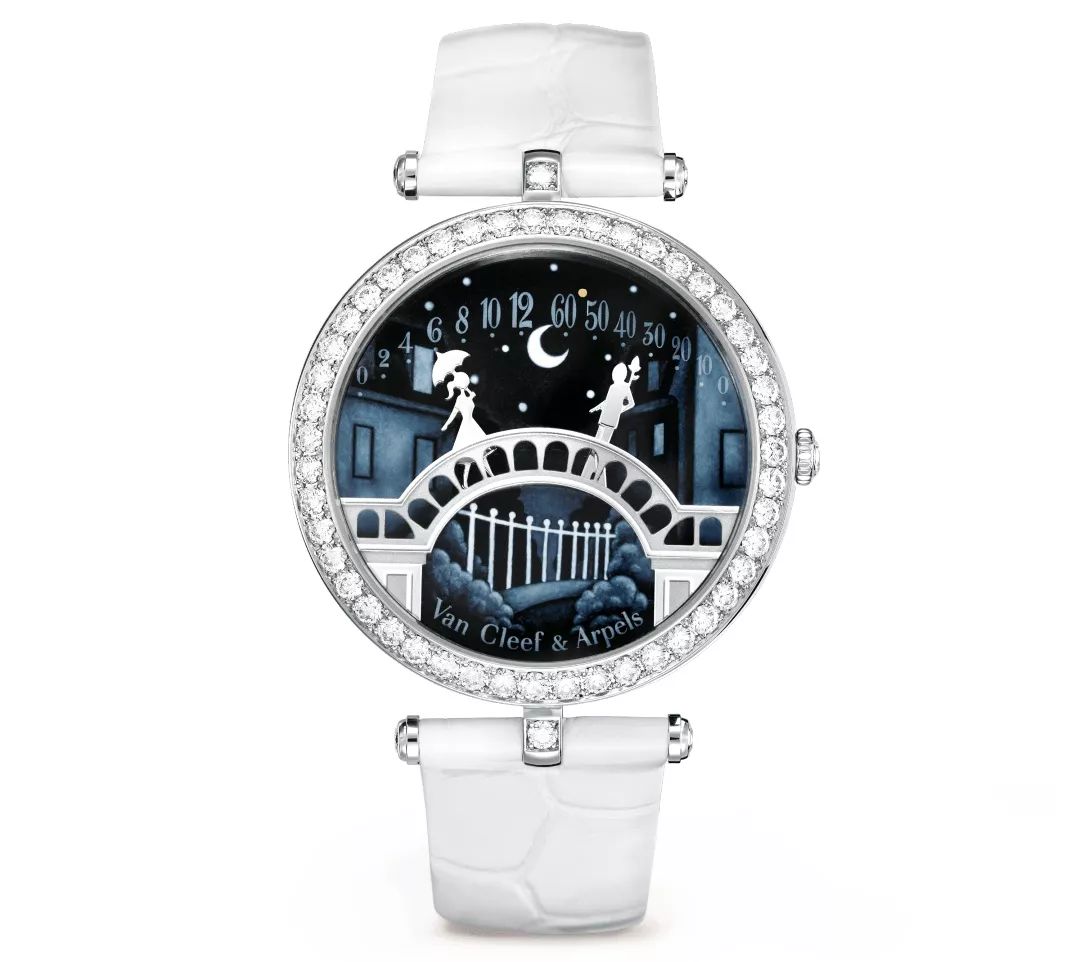 梵克雅宝(Van Cleef & Arpels)的Lady Arpels Pont des Amoureux“情人桥”腕表非常有名,盘面以珐琅工艺打造,其上以金属雕刻出拱桥与一男一女两个人偶。他们分立于桥的两端,随着时间流逝,逐渐向桥心靠拢。左边的仕女每12小时移动至桥心,用伞尖指示小时刻度;右边的男士每60分钟移动至桥心,用手持的玫瑰花指示分钟刻度,在达到60分钟时逆跳回0的位置,就这样反复徘徊。直到12:00或24:00,他们终于在桥心邂逅相拥。之后各自逆跳回盘面两端,继续期待下一次的重逢。