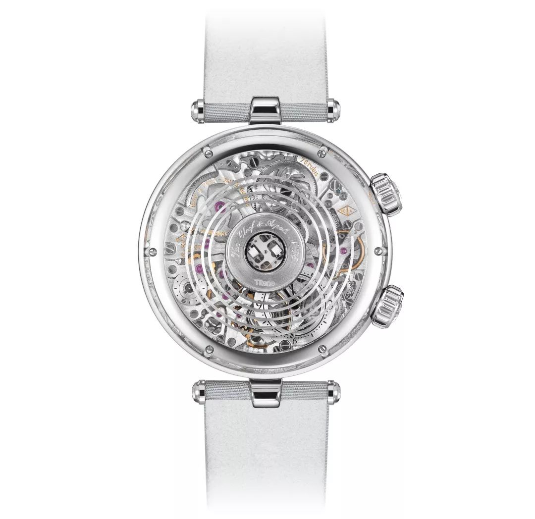 白金表壳38毫米,搭载手动上链机械机芯,配备由Agenhor为梵克雅宝独家研发的逆跳模块,动力储存30小时。虽非限量版,但产量极低,每枚皆有编号。