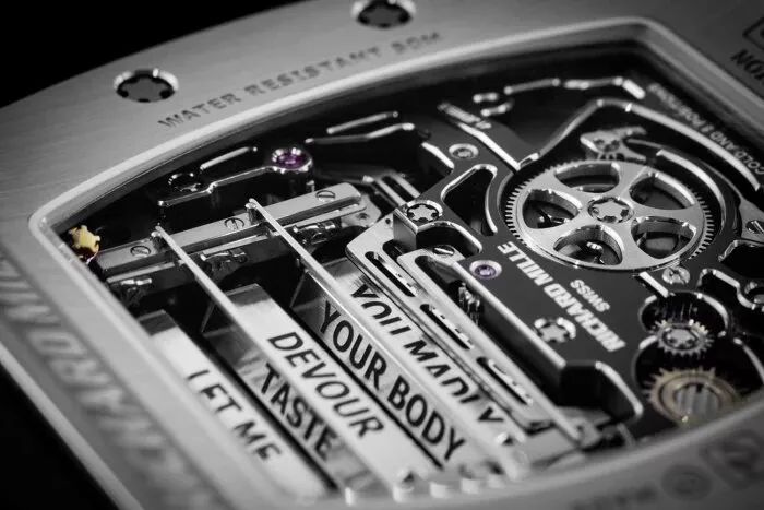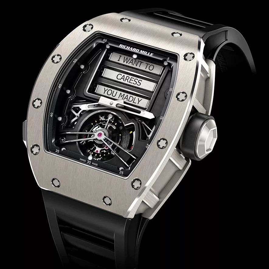 除了法文版的Margot腕表,另有阿拉伯文版本的Layla腕表。经过暗恋时的暧昧试探,初恋时的忐忑思念,此时进行到了热恋时的狂野激情。理查德米尔(Richard Mille)的RM69情色陀飞轮腕表,让恋人们大胆说出心底赤裸裸的欲望!