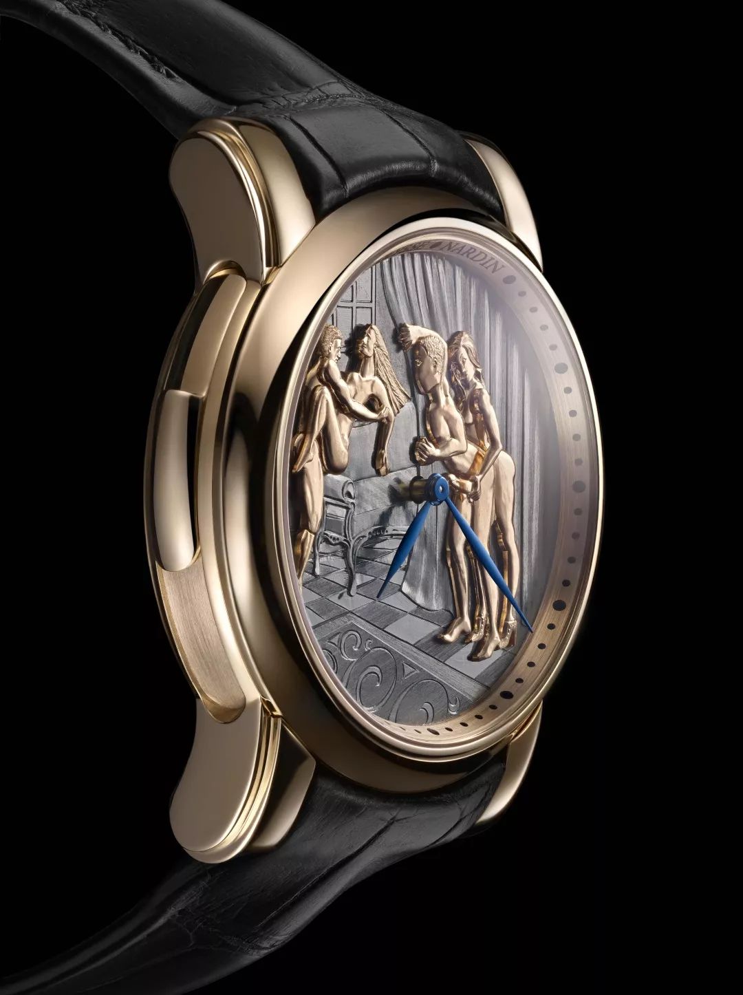 细节就不详加描绘了,大家自己欣赏图片。但既然是活动人偶三问报时腕表,不妨猜猜看,当报时机制开启,盘面上的两对爱侣各会做出什么样的动作呢?