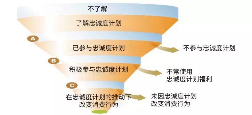 很多企业的“忠诚度计划”,都发在A点和B点(见下图)——即顾客加入了一个会员计划但没有积极使用它时。而对于“漏斗”其它层面的消费者,企业常常只为他们提供了解或者注册途径,却没有向他们指明使用的方向。