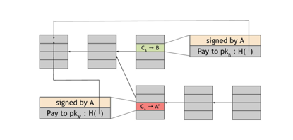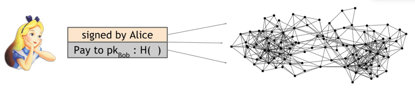 回想一下,一个交易是一个包含Alice签名的一个数据结构,一个支付给Bob的公钥指令,和一个哈希。这个哈希表示一个Alice收到的先前交易输出的指针,现在正在消费。该指针必须引用在共享链中先前区块中的交易