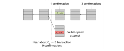 事实上,双重支付的概率随着确认的数量呈指数下降。那么,如果你感兴趣的交易已经收到K确认,那么双重支付交易出现在长期共识链上的概率指数下降为k的函数。在比特币生态系统中使用的最常见的启发式是等待六次确认。数字六并没有什么特别的。这仅仅是一个很好的,在你等待的时间和保证你感兴趣的交易最终出现在共识区块链上的折衷方案。