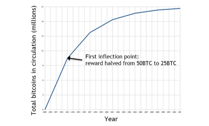图2.4 区块奖励每四年减半,将比特币的总供应量限制在2100万