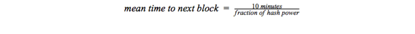 我们来想想这是什么意思。如果你是一个矿工,而且你已经将一定数量的硬件投入比特币矿业,但整体采矿生态系统正在增长,更多的矿工正在进军,或者他们正在部署更快的硬件,这意味着在两个星期的时间里,比预期的区块要多一些。因此,节点将自动重新调整目标,并且你能够找到一个区块需要做的工作量将会增加。所以如果你投入固定的硬件投资,你发现区块的速度实际上取决于其他矿工在做什么。有一个非常好的公式来捕获这一点,这就是说,任何给定的矿工Alice将要赢得下一个区块的概率相当于她控制的全局哈希能力的百分比。这意味着如果Alice的采矿硬件占总哈希能力的大约百分之零点一,那么每1000个区块中大约会有一个区块被她发现。