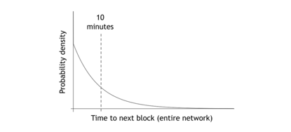 解决哈希谜题是概率性的,因为没有人可以预测哪个随机数能解决哈希谜题。唯一的办法是一个接一个地尝试随机数,希望一个能成功。在数学上,这个过程被称为伯努利试验。伯努利试验是一个具有两个可能结果的实验,每个结果发生的概率在连续试验中是固定的。这里,两个输出结果就是哈希是否落在目标中,并假定哈希函数的行为像一个随机函数,这些输出结果的概率是固定的。通常,节点尝试伯努利试验的许多随机数,一个离散的概率过程,可以很好地被连续概率过程近似地称为泊松过程,过程中所发生的事件以恒定的平均速率独立发生。所有这些的最终结果是,显示找到下一个区块的时间的相对可能性的概率密度函数如图2.5所示。