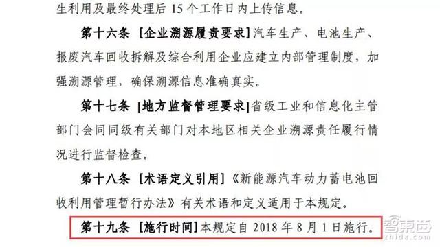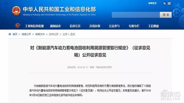 2018年5月17日,为加强新能源汽车动力蓄电池回收利用溯源管理,工信部发布《新能源汽车动力蓄电池回收利用溯源管理暂行规定》(征求意见稿)公开征求意见。