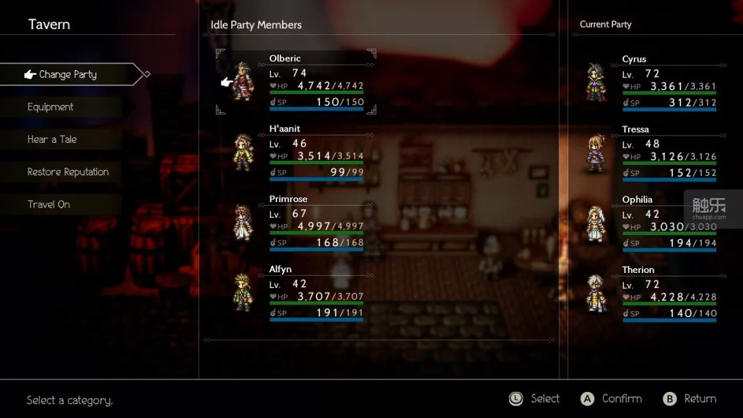 我们真的需要这么多顶级装备吗?当然不。要通关8位主角的主线,只要有一两个40级以上的主力,就可以带着后段班打Boss了。游戏中最难的战斗,是只有4个上级职业的祠堂和最终隐藏Boss;上级祠堂建议挑战等级是50,无论你先挑战哪一个,都是第一个最难,第二个次之,之后就轻松打了,因为你已经装上了上级职业的技能,主力队员的等级也已经更高。