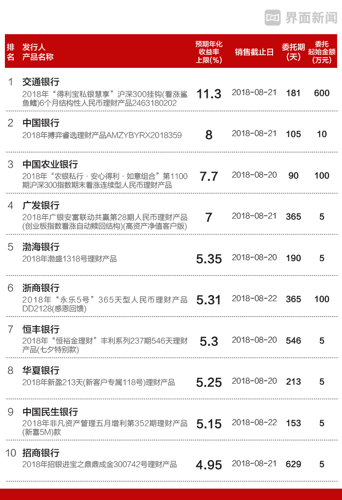 来看看本周有哪些可以挑选的银行理财产品,本周,18家国有商业银行和股份制商业银行全国范围在售针对个人的人民币理财产品222只,其中未包含结构性存款银行理财,界面新闻从每家筛选了收益率最高、最值得关注的理财产品,共10只。