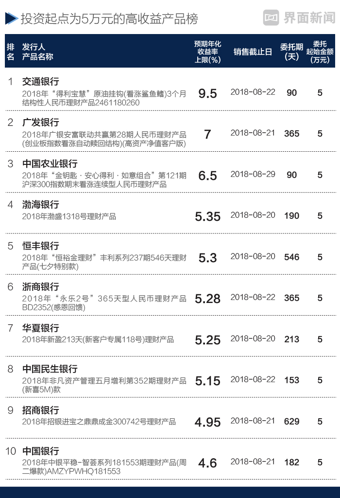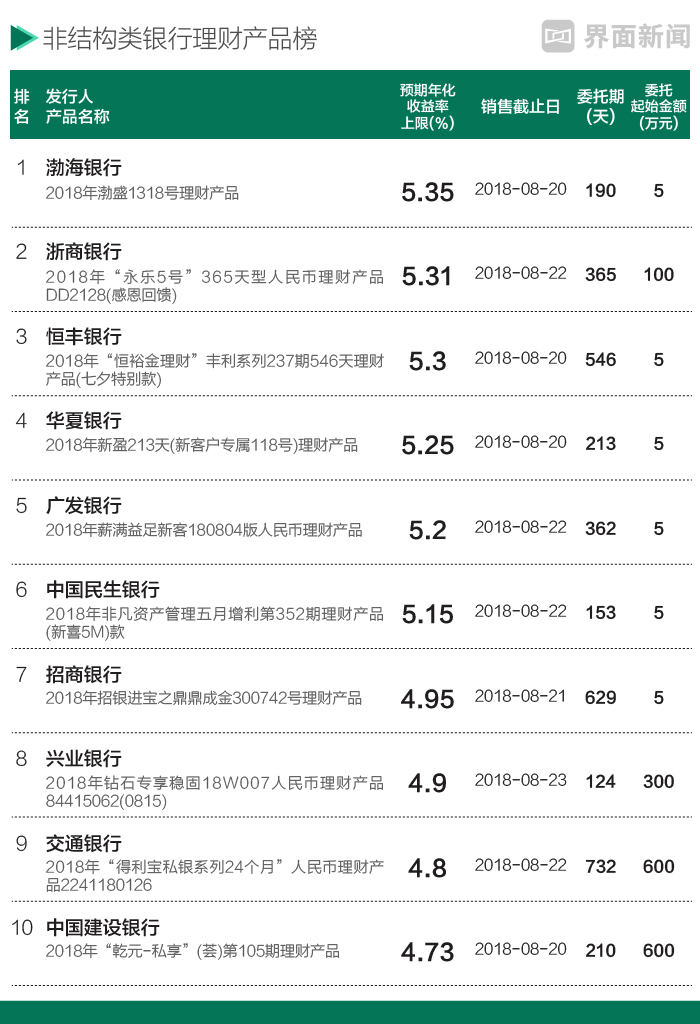 考虑到投资者的拟投资金额、风险偏好不同,本期还对起点为5万元的银行理财产品以及抛去结构化产品收益复杂设置、收益相对稳定的非结构类理财产品进行筛选,做成榜单,供投资者参考。