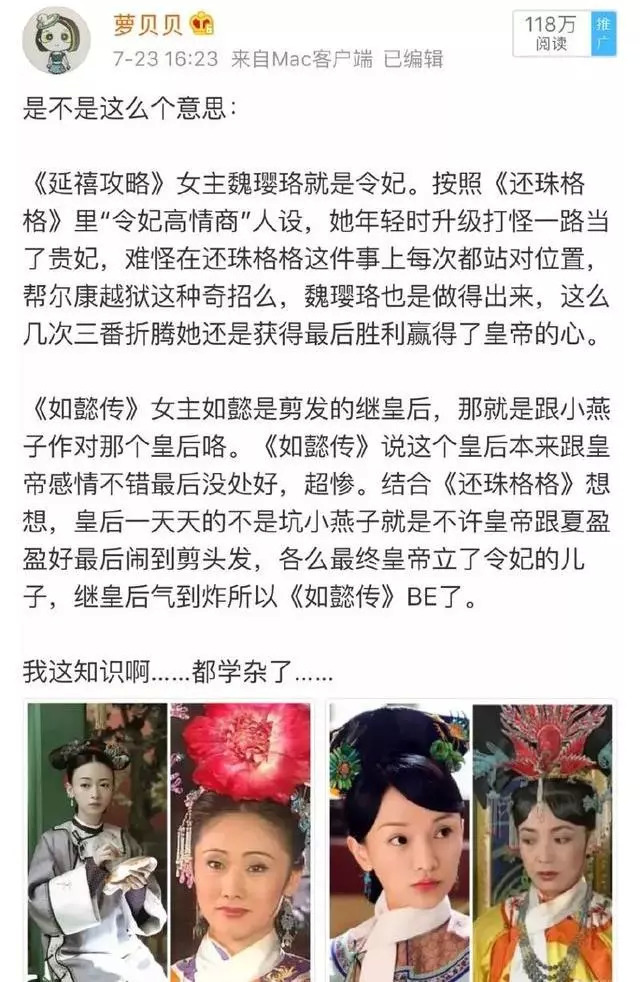 如《延禧攻略》播出后,观众惊奇于福安康、永琪、紫薇等人与《延禧攻略》的关系。一篇阅读量火速超过10万+的微信推文,正是以《清宫言情宇宙:如何串起还珠格格甄嬛传如懿传延禧攻略?》为主题。在这篇推文中,无论是宫斗剧还是言情剧,只要是经典的清宫戏的人物们,来了一次大串联,竟然形成了独特的知识体系。