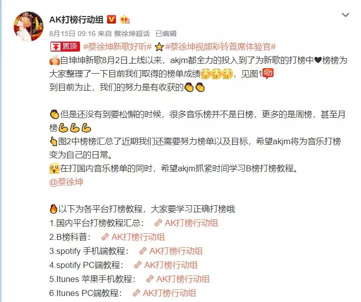 搬家战争只是所有打榜“战争”中的冰山一角。据不完全统计,蔡徐坤的粉丝每天至少需要完成亚洲新歌榜、超话签到等九个榜单的工作,为了维持顶级流量爱豆的位置,粉丝大军穿梭各大榜单中,从未停下。