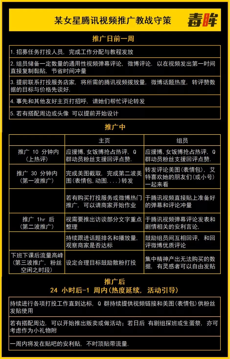 行动计划和细节也在不断完善,涛哥提供的一份某明星视频推广方案显示,在推广日的前一周、10分钟到1小时、下课下班流量高峰、一周内,每个时间点都有专门的安排,保证一场推广行动的胜利。