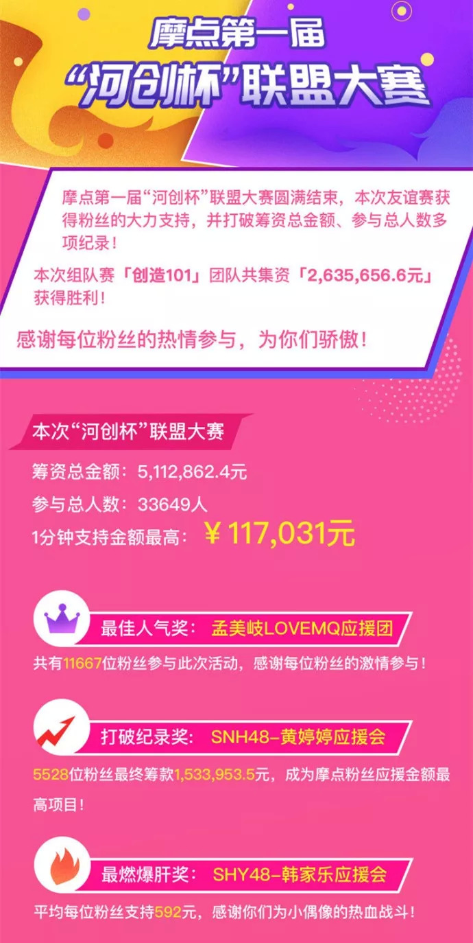 除了功能性集资,集资有时只是一件“面子工程”。摩点集资举办的第一届“河创杯”联盟大赛中,101系和SNH48系同台竞争,获胜组可获得摩点一日APP开屏和五日Banner宣传位奖励,失败组要在应援会发布一条获胜组的安利推广微博、并全组将超话头像换成表情包一天。