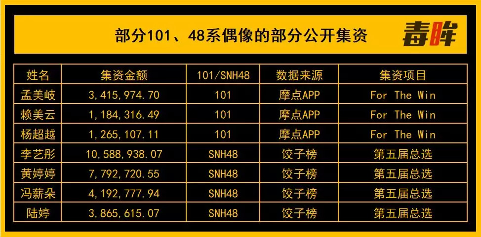 短短3天,总筹集金额达500万元,101系参与人数达23813人、筹资260多万,获得胜利,这在48饭圈内掀起轩然大波。一位48系资深粉丝告诉毒眸,比赛之前,48系戏称101为“村外”集资(团队不成熟,粉丝协作力低),最终,48系集资人数只有9836人,远低于101系。活动结束后,参与竞争的黄婷婷粉丝被48系饭圈集体声讨。