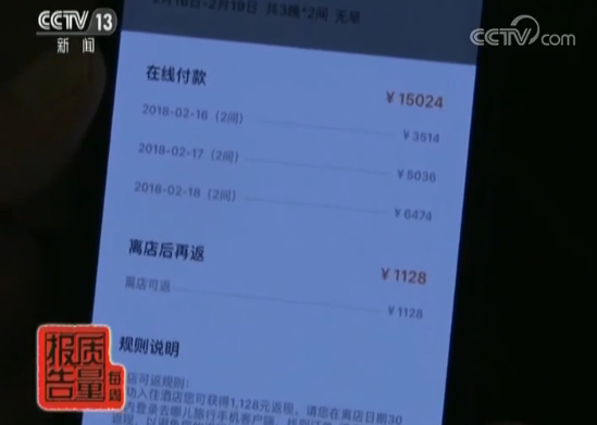 消费者 张先生:我是在去哪儿网上订房的,入住一个月之前订的,预订的是那种不可取消的类型,连续三晚,每天是两间房,总金额15024元。