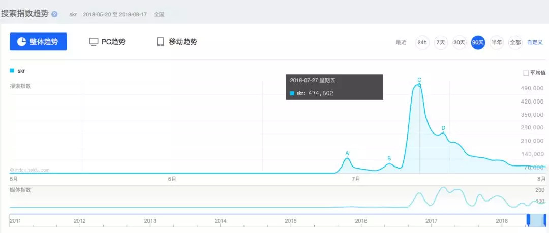 与去年的freestyle一样,今年的skr依然引爆全网,甚至在传播上的灵活性比freestyle更胜一筹,内容的多样性使得skr知名度更广。据百度指数,skr一词在7月27日的搜索量超过47万,其资讯指数在28日迎来暴风式增长,超过120万。