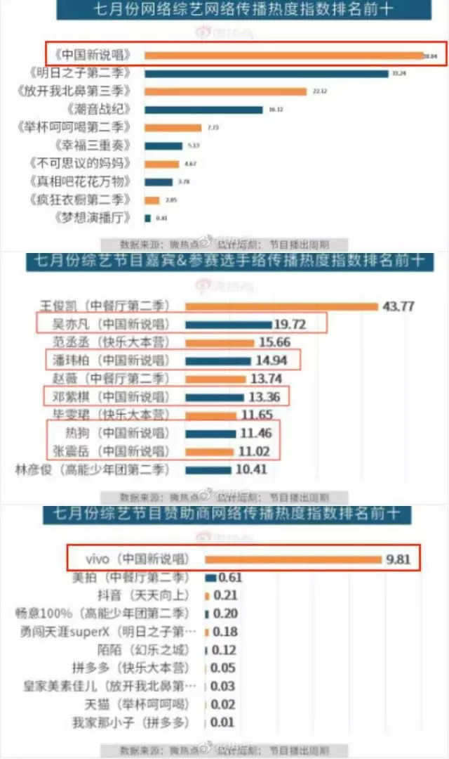 7月份的微热点报告中,73档综艺,《中国新说唱》凭借单集平均1.4亿的播放量,节目主话题超41亿的阅读量、2512万讨论量,以及微博话题榜总榜、综艺榜双榜第一,百度风云榜综合、内地榜双榜第一等好成绩,稳稳占据着网络综艺网络传播热度的第一名。