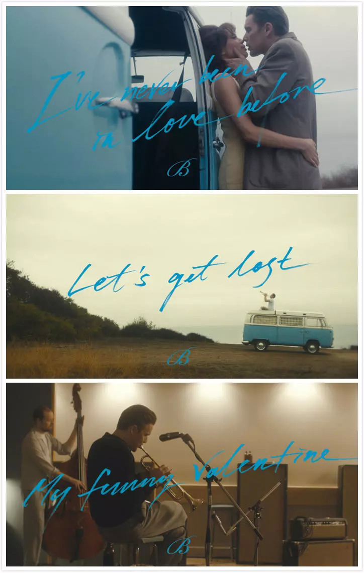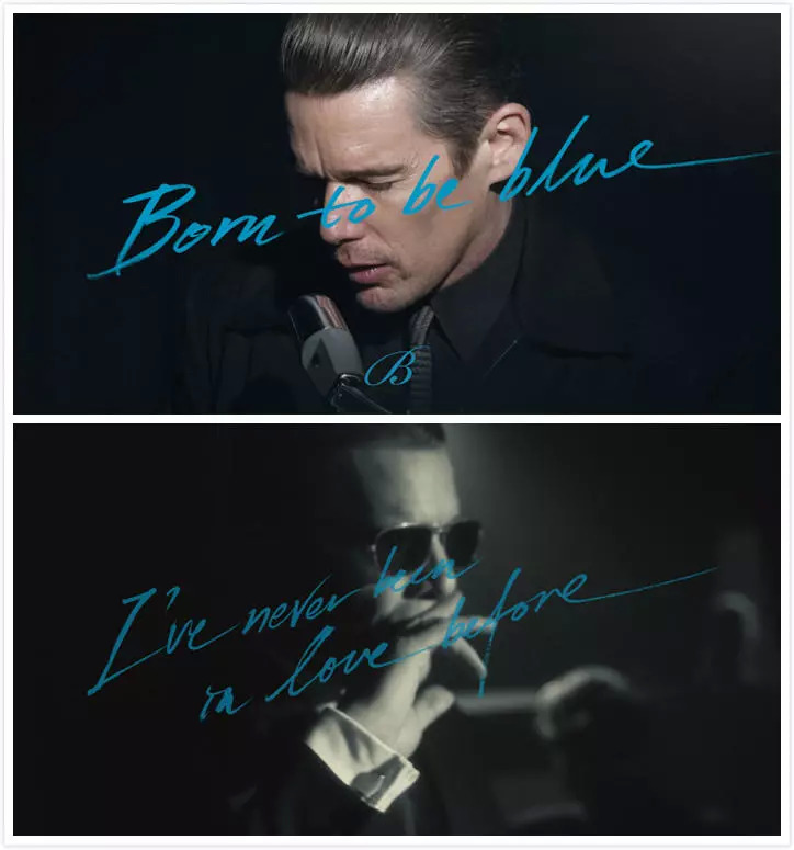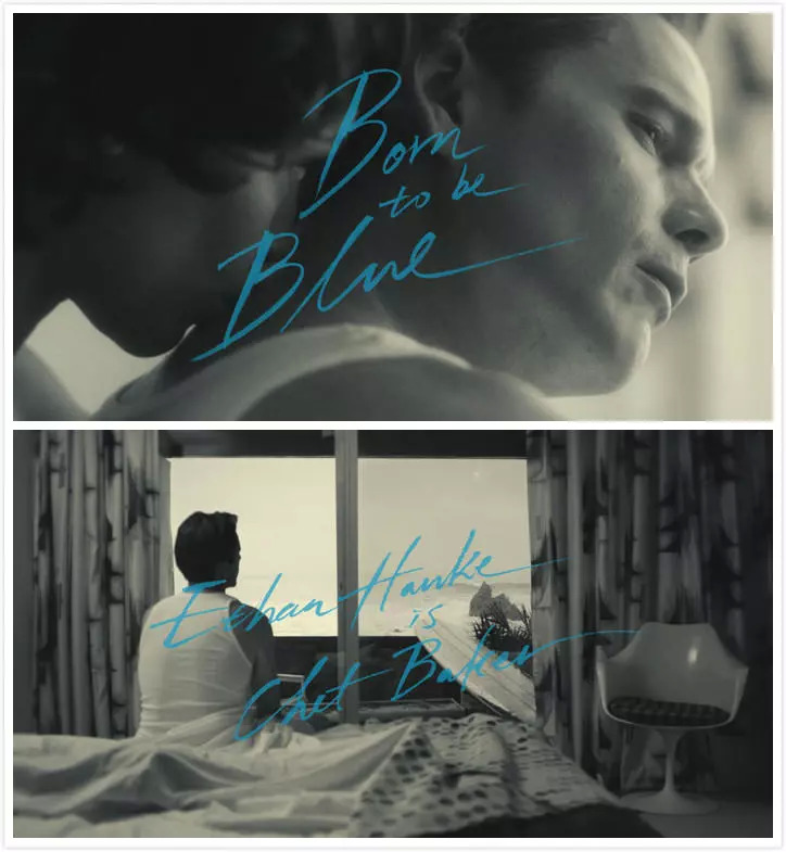 《生为蓝调》(Born to Be Blue)明信片海报:黑白影像与蓝色字体可以如此和谐。