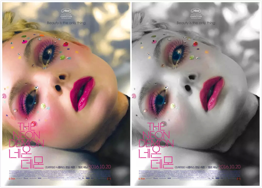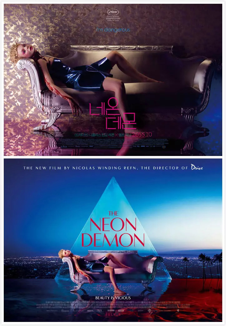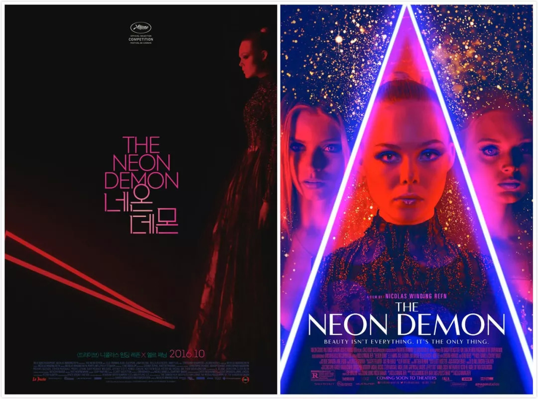 《霓虹恶魔》(The Neon Demon)主海报:相比右侧美版海报,韩版海报构图更别致,片名字也被设计成霓虹灯的质感。