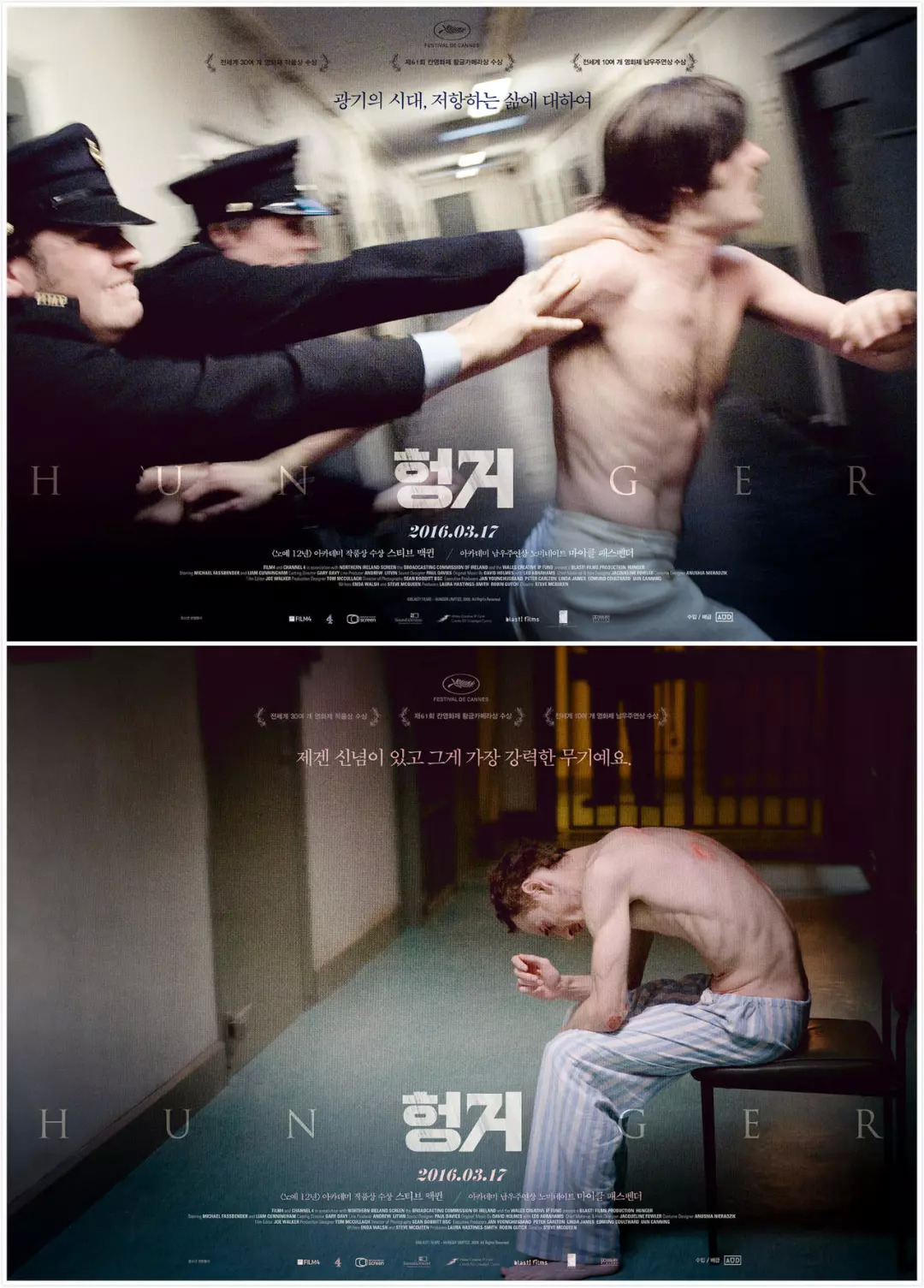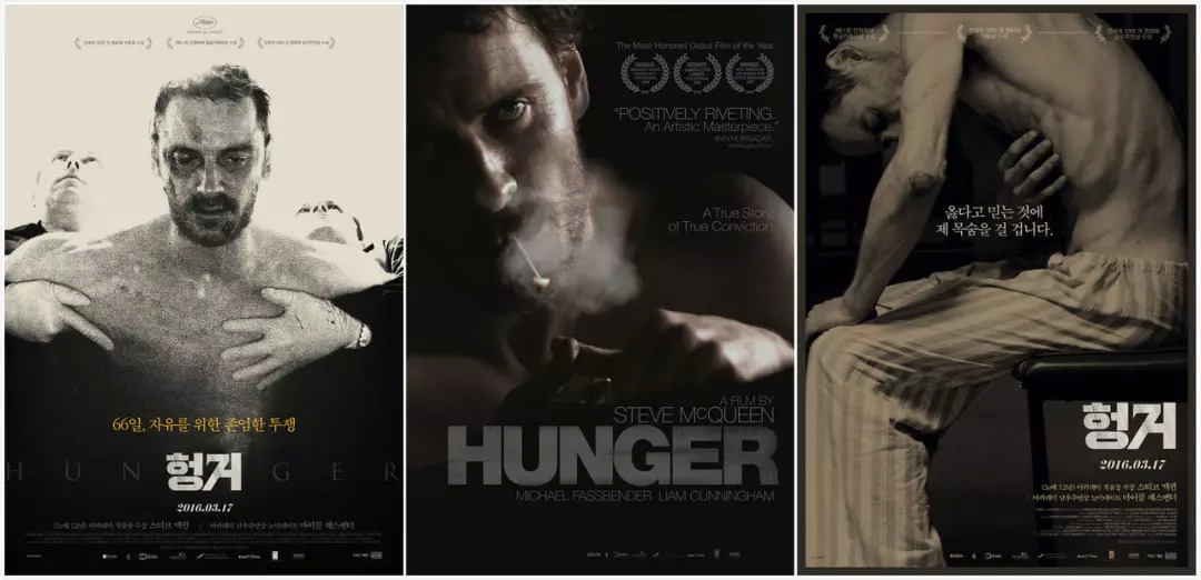 《饥饿》主海报:区别于原版海报(中)的两款全新设计的韩版海报,分别选取了影片中两个不同的角色瞬间,黑白色调更具视觉冲击力。