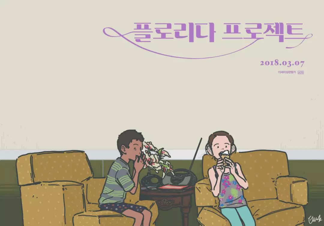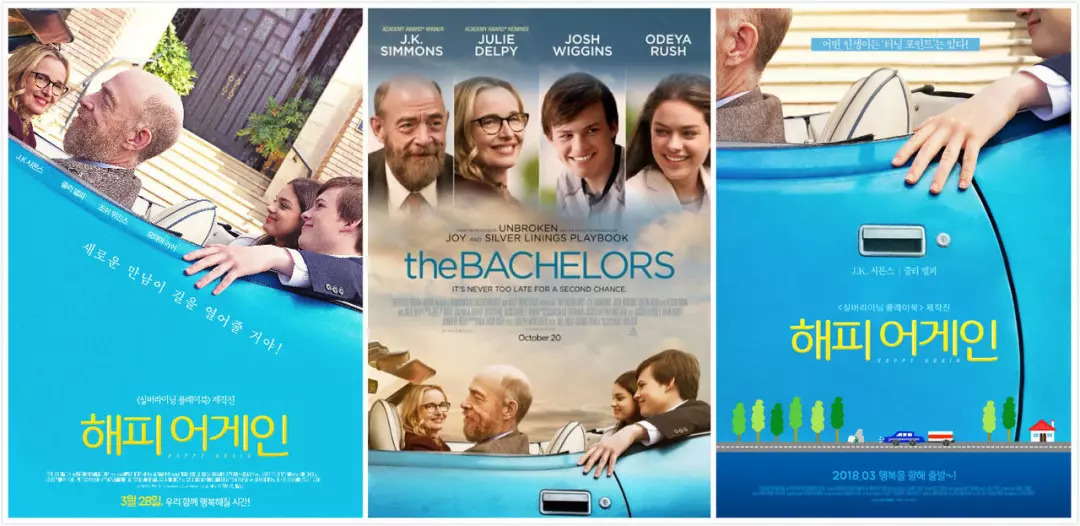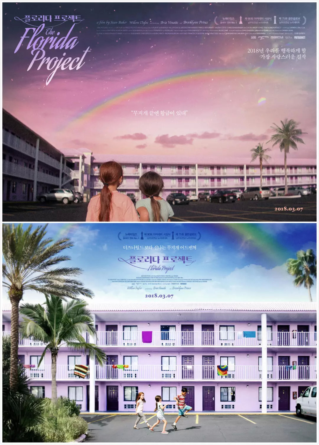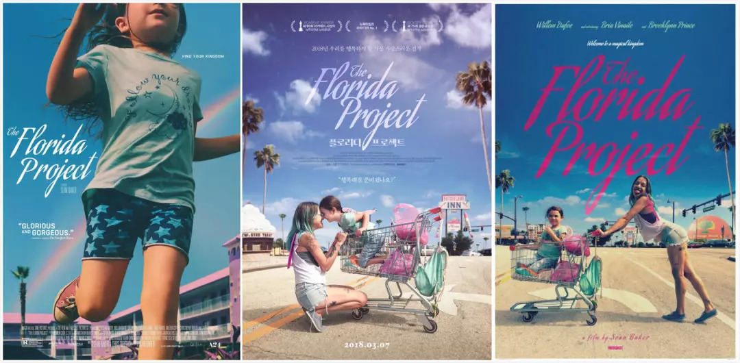 《佛罗里达乐园》主海报:左右两边分别是影片的正式海报和预告海报。中间的韩版海报沿用了原版海报艳丽而又怀旧的色调,但却选取了一个更“煽情”的瞬间。