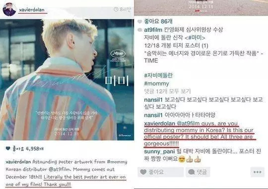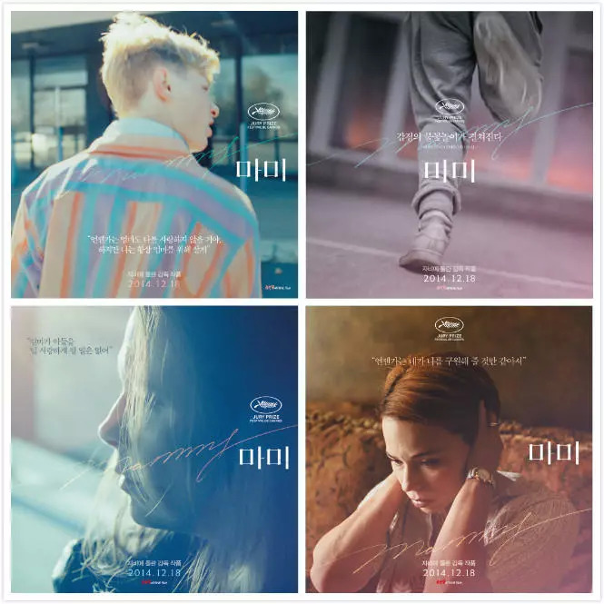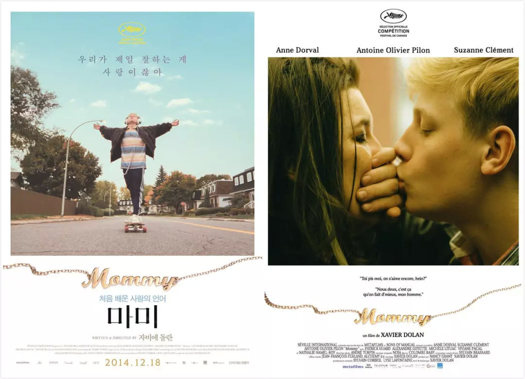 而韩国似乎一直都有为引进片重新设计海报的传统。利用剧照设计成套的明信片式海报,用简约的设计装点一个个影像瞬间,是最为常见的操作。最为成功的一套设计当属《妈咪》的海报,当年曾获得了导演多兰的亲自转发点赞。