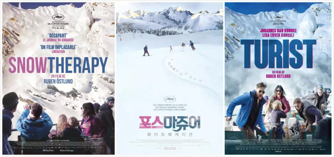 《不可抗力》(Force Majeure)主海报:左右两款海报是经典款,韩版主海报也有沿用,但韩国设计师还是手痒做了一张十分与众不同的海报。“雪灾来啦”几个字辈歪歪扭扭的摆在了弯曲的滑板雪印旁边,有些轻佻,透着冷冷的幽默感,白色的雪景“留白”一样引人遐想。