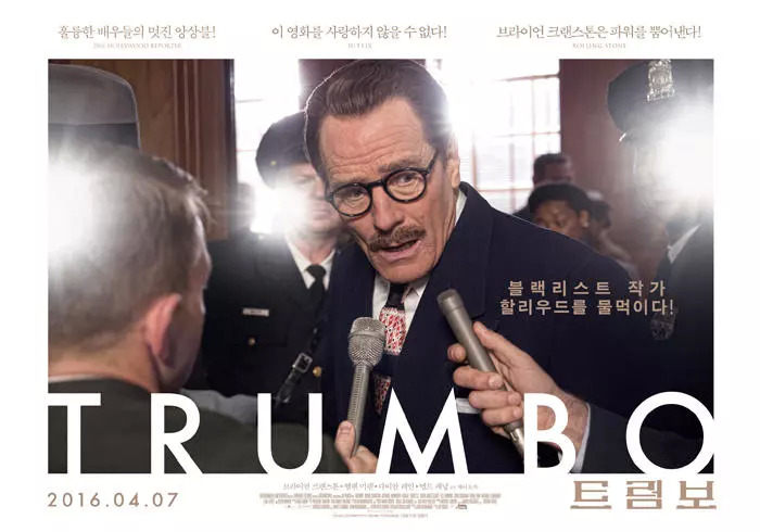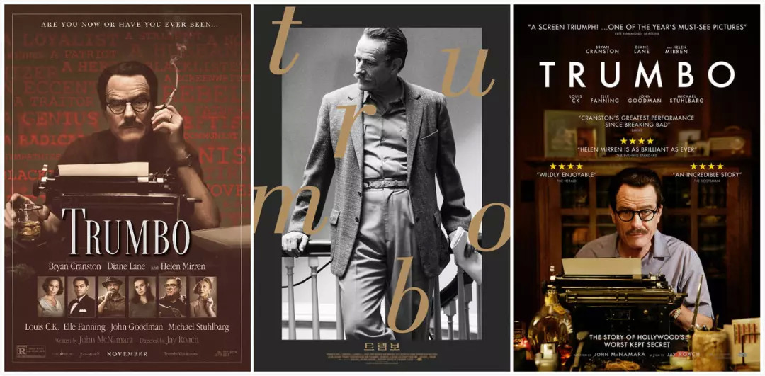 《特朗勃》(Trumbo)主海报:左侧为美版海报,右侧英国海报。要论文艺范,显然是中间的韩版海报。片名变成了不规则排列的字母,这种设计突显出片中的打字机元素。