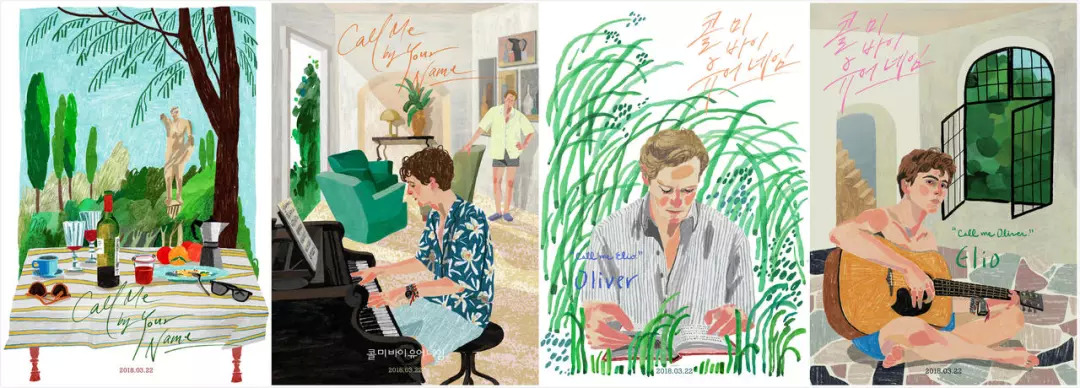 《请以你的名字呼唤我》手绘海报:色调明艳的一组插画海报,扑面而来绚烂的夏日气息。