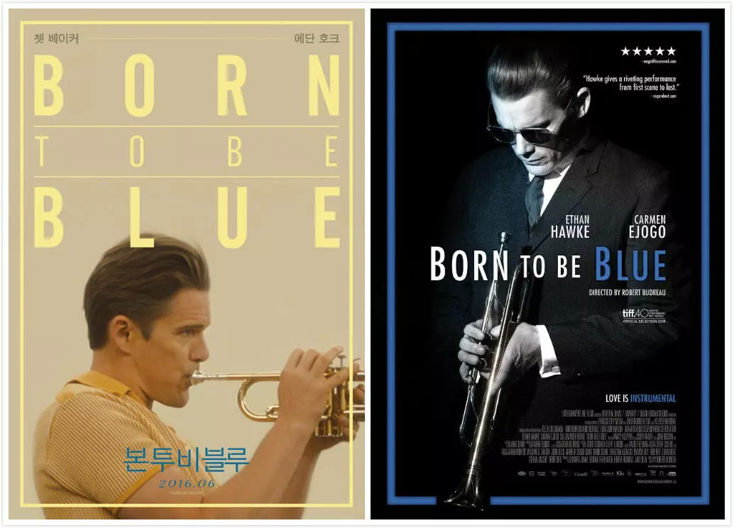 《生为蓝调》(Born to Be Blue)主海报:相比右侧的原版海报,韩版海报完全变换了基调,更明亮的配色,突显韩式小清新。