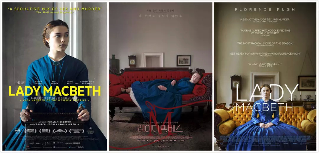《麦克白夫人》主海报:左侧为英版海报,右侧是美版海报。中间的韩版海报别出心裁的选用了女主人公睡姿的剧照,并且对沙发做了调色处理,相比英美版的清亮色调,更显出一丝鬼魅。