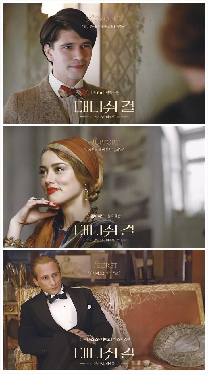 《丹麦女孩》(The Danish Girl)角色明信片海报:这组角色海报被用心的标注上了每个人物不同的关键词,雀斑是“勇气”,坎妹是“爱”,小本是“浪漫”,闺蜜是“支持”,雀斑好友是“神秘”。