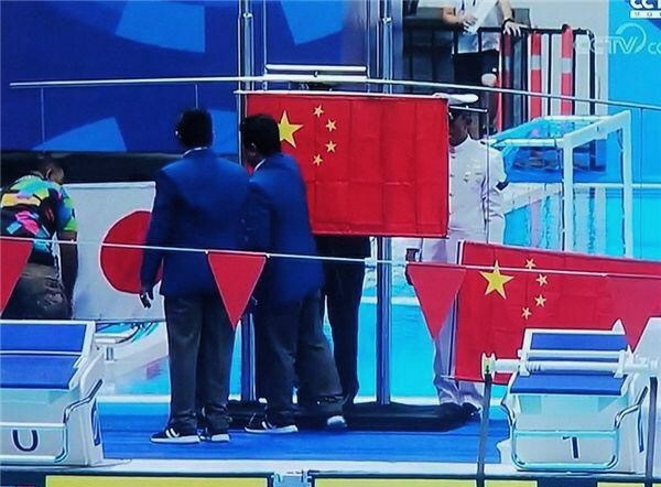 当时在孙杨登顶的200米自由泳颁奖仪式上,中国国歌响起,观众起立行注目礼。但在国歌接近尾声时,悬挂国旗的横杆意外断裂,导致国旗突然掉下,现场观众立即发出不满嘘声。