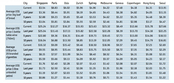 【2】前五位的排名相对2014年没有变化,依然是新加坡,巴黎、奥斯陆、苏黎世及悉尼。