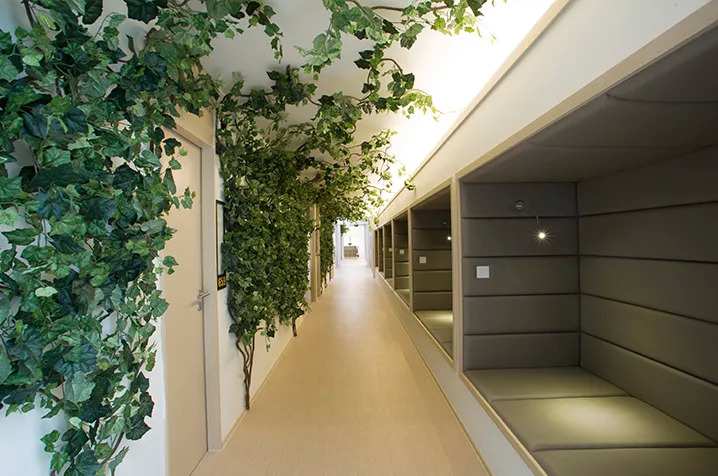 每家方糖小镇都有一个标配——哲学小径,给入驻空间的员工提供了午睡和思考的区域,安置在墙壁上的大片绿植能让紧绷的神经获得放松。