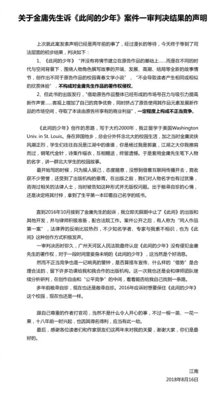 2018年8月16日,法院一审宣判《此间的少年》构成不正当竞争,认为《此间的少年》并没有将情节建立在金庸作品的基础上,并未侵害金庸所享有的改编权、署名权、保护作品完整权,但在图书出版、策划发行领域与金庸存在竞争关系,违反了我国反不正当竞争法。