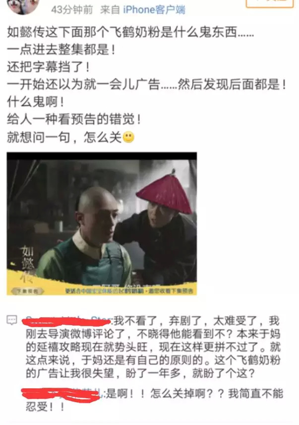 《如懿传》片方进行宣传时,一直把精良的制作作为关键词,然而今日首播出现如此重大的贴片广告失误,对剧集本身口碑产生了极大影响。而对于合作品牌飞鹤来说,如此露出虽然曝光时间长,但是也造成了对品牌的负面口碑影响,得不偿失。