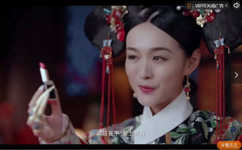 每集播放前,非会员需要体验60S的广告后才能进入片头曲时间。而这些广告中不乏剧中演员饰演的妃嫔手拿彩妆、饮品,念着广告词的操作。